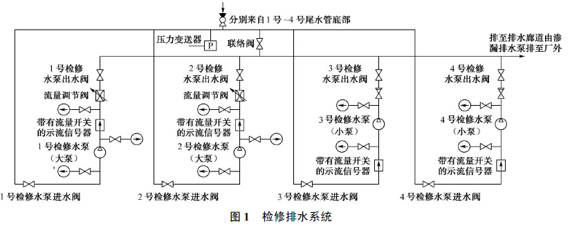 桐柏电站的检修排水系统, 共设4 台排水泵, 如图1 所示, 1 号、2 号检修水泵(大泵)用于排空引水隧洞、蜗壳、尾水管、尾水隧洞内的水;3 号、4 号检修水泵(小泵)用于球阀、上下库闸门等的渗漏排水。每台检修水泵均配置逆止阀、压力表和带流量开关的示流信号器, 在1 号、2 号水泵出水管处各安装了一个流量调节阀。系统中共有2 根总管, 一根为水泵的总吸水管, 包括从每台机组尾水管底部至总管的支管, 总吸水管和部分支管及管路上的操作阀门布置在厂房管路廊道中;另一根为总排水管, 可将水排至渗漏集水井中, 再经渗漏排水泵排至下库。