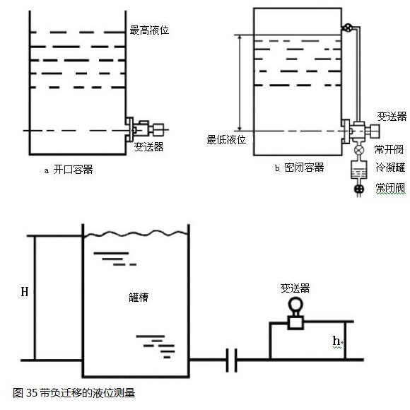 差压式液位变送器安装在低液位的同一水平高度上。测量开口容器时,仪表负压室通大气。测量密封容器时负压室通容器上部,此时若负压室保持干燥,则可不装冷凝罐,若安装冷凝罐应定期将罐中的冷凝液排出;排液时应将常开阀关闭,以免变送器承受单向压力,见图34。